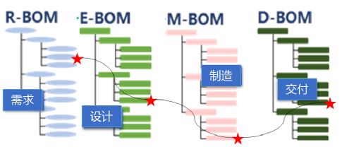 举个例子,下图中小红星代表了我们要找的零件的一个具体信息,它在不同的业务阶段可能在不同的“树杈”上,但这四棵不同的“树”之间可以通过固定的逻辑进行溯源,因为它们的本质都是产品的分解架构,只是视角不同而已。如此一来,我们要找的目标零件信息就不再是数据海洋中漂流的孤岛,而是被X-BOM这棵大树紧紧串联在一起,不论漂到哪儿,都能找到自己的“前世今生”。